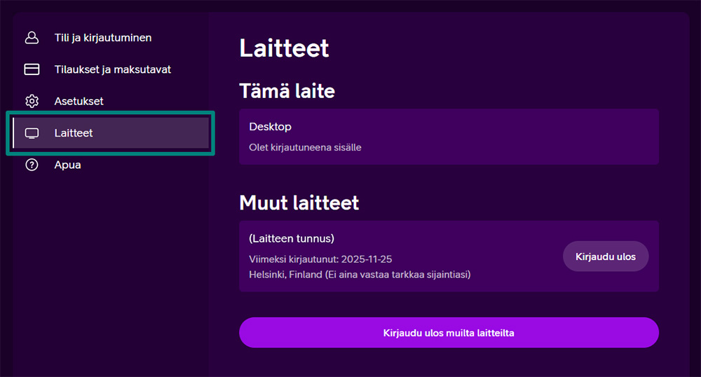 Joissain tilanteissa voi olla tarpeen kirjautua ulos yhdeltä laitteelta tai kaikilta laitteilta, joilla tunnuksesi on parhaillaan käytössä. Kaikilta laitteilta uloskirjaaminen kattaa kaikki nettiselaimet, älylaitteiden sovellukset, Apple TV:n sekä digiboksin.