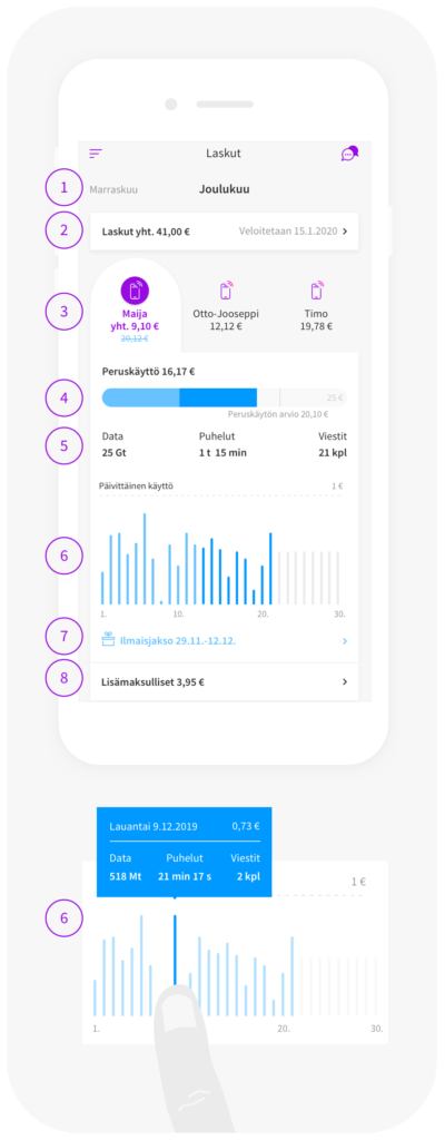 Tästä näet, miten olet käyttänyt liittymääsi eri päivinä. Kun liikutat sormeasi diagrammin päällä, näet puheluiden, viestien ja käytetyn datan määrän sekä niistä kertyneen hinnan jaoteltuna päivittäin. Vaaleansininen väri pylväissä kuvaa maksuttomia peruskäyttöpäiviä (esim. tutustumisjakso).