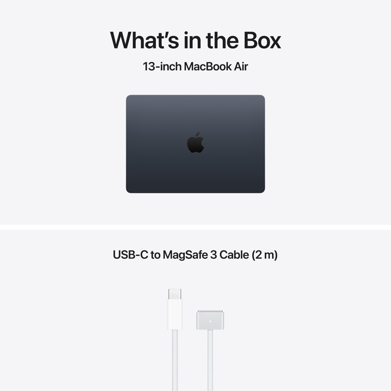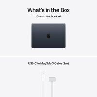 Huomio: 13 tuuman MacBook Airin mukana tulee USB C–MagSafe 3 latausjohto, mutta ei virtalähdettä. Tämän laitteen lataaminen edellyttää USB C-virtalähdettä tai muuta USB PD -virtalähdettä, joka voi tarjota 30 W tai enemmän virtaa. Optimaalista lataamista varten Apple suosittelee, että tähän Maciin liitetään Applen 30 W USB C-virtalähde tai 70 W USB C-virtalähde. Näin voidaan hyödyntää pikalatausta (jopa 50 % lataus 30 minuutissa).*