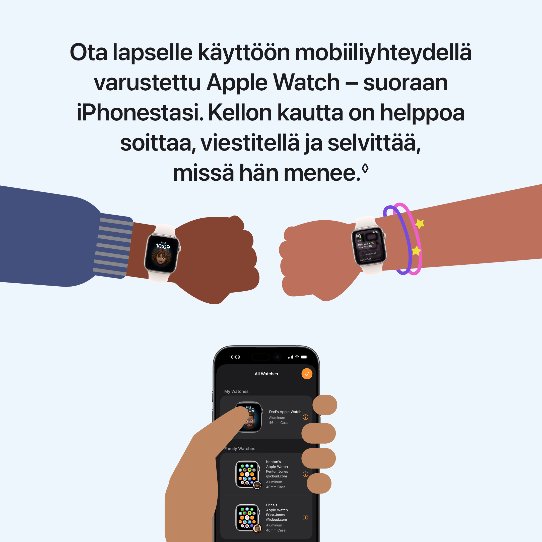 *Kaikki ominaisuudet eivät välttämättä ole käytettävissä, jos Apple Watch otetaan käyttöön Lasten Apple Watch -toiminnon kautta. Lisätietoja osoitteessa https://support.apple.com/fi-fi/109036. Mobiiliyhteyteen tarvitaan langaton operaattorisopimus. Tarkista operaattorit ja ehdot osoitteesta apple.com/watch/cellular.