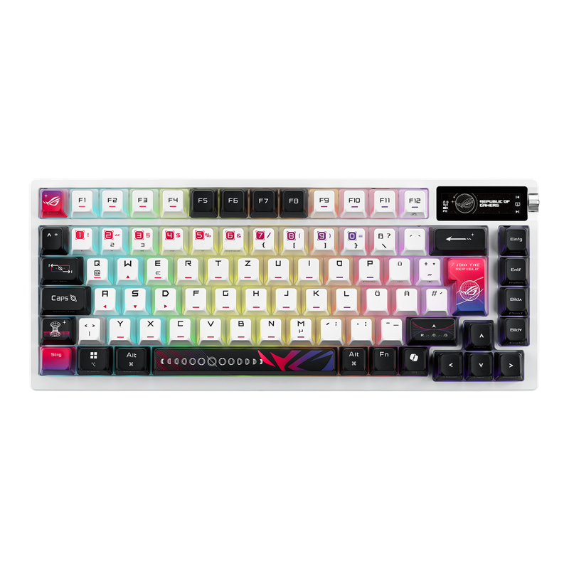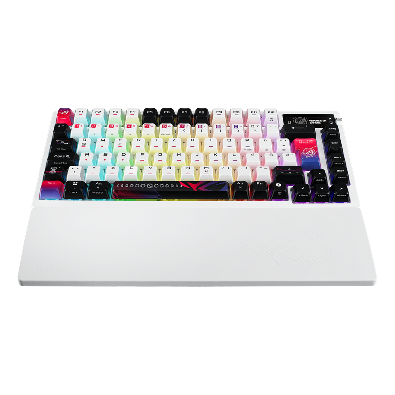 ROG Azoth X on 75 % mukautettava pelinäppäimistö, joka on suunniteltu vaativille pelaajille ja näppäimistöjen harrastajille, jotka vaativat tarkkuutta ja monipuolisuutta. Siinä on hot-swap ROG NX Mechanical Switches V2 -mekaaniset kytkimet ja Stellar-aiheiset värisublimoidut ROG-näppäinkorkit, jotka lisäävät kestävyyttä ja estetiikkaa. Etelään suunnattu piirilevy takaa yhteensopivuuden monenlaisten kytkimien ja näppäimistöjen kanssa, ja viisi vaimennuspylvästä, tiivisteen kiinnitys ja FR4-asemalevy toimivat yhdessä tarjotakseen hienostuneen kirjoituskokemuksen. Azoth X:ssä on OLED-näyttö, jossa on intuitiiviset ohjaimet, kolmitoiminen liitettävyys, mukaan lukien 2,4 GHz:n ROG SpeedNova -tekniikka, silikoninen kämmentuki, kolme kallistuskulmaa ja Mac-tuki.