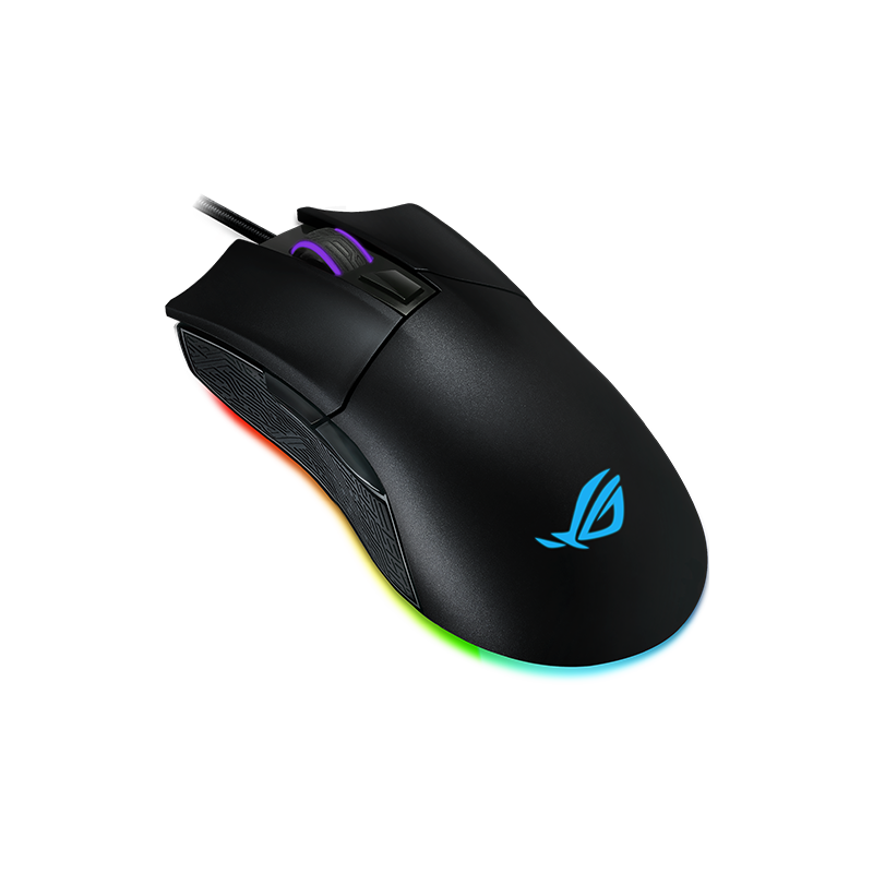Kumiset sivupidikkeet, punottu kaapeli, OMRON-kytkimet, irrotettava micro-USB-kaapeli, erilliset oikeat/vasemmat painikkeet, Alps vierityspyörän koodain, ASUS Aura Sync RGB LED, DPI-kytkin