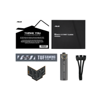SpeedSetup -ohje, kiitoskortti, adapterikaapeli (1 to 3), TUF näytönohjaimen pidike, TUF velcrotarra, TUF jääkaappimagneetti, TUF Gaming -sertifikaatti