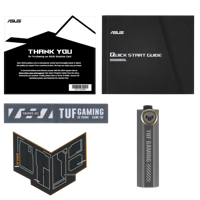 SpeedSetup -ohje, kiitoskortti, TUF-velcrotarra, TUF jääkaappimagneetti, TUF näytönohjaimen pidike, TUF luotettavuustodistus