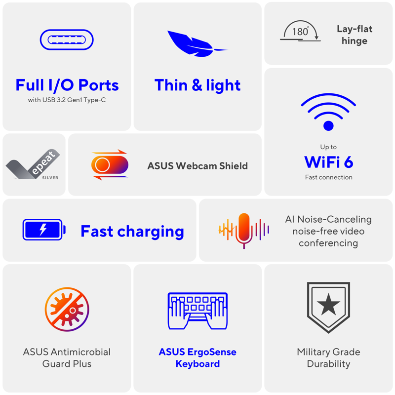 Vivobook Go 14:n näyttö on todella tarkka, ja kapeiden NanoEdge kehysten ansiosta näyttötilaa on tavanomaista enemmän. Moniajo on siis entistäkin sujuvampaa ja katselukokemus mukaansatempaavampi. Näytölle on myös myönnetty TÜV Rheinland -sertifiointi merkiksi siitä, että se rasittaa silmiä tavanomaista vähemmän pitkäkestoisen käytön aikana.