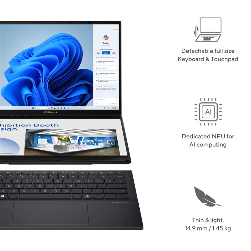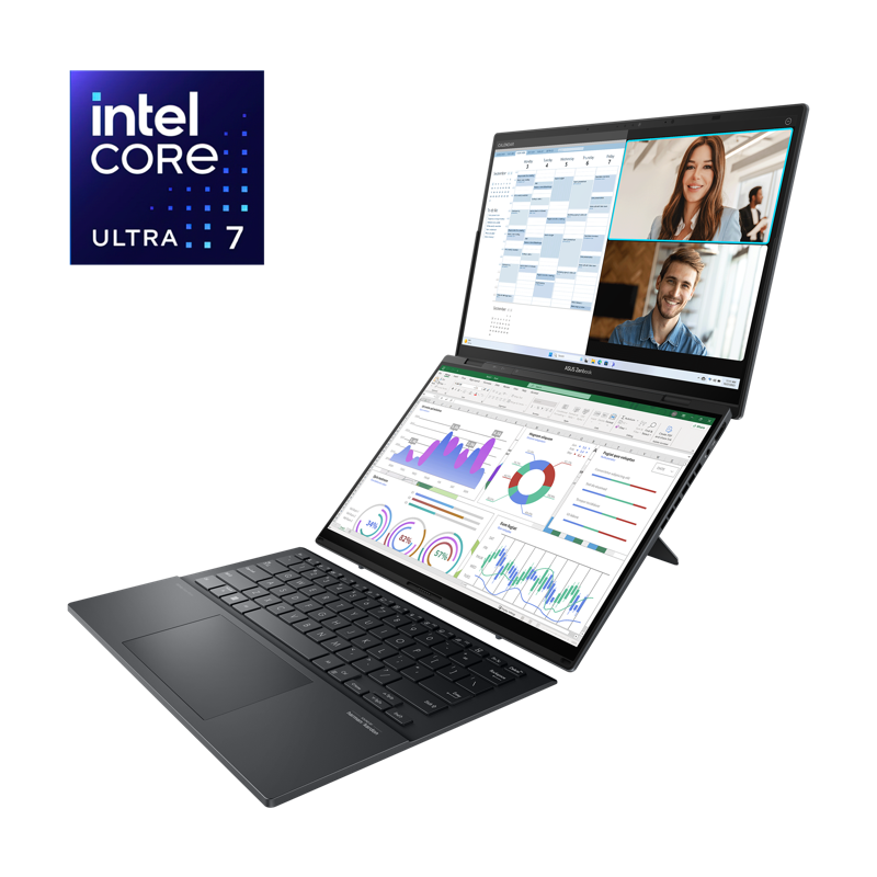 Zenbook DUO tarjoaa tehokkaan suorituskyvyn ja AI Ready -ominaisuudet. Huippunopea prosessori, oma NPU ja grafiikka tekevät tehtävistä helpompia nykyään AI-parannuksen avulla. Sen 1 TB SSD-tallennustila, 32 GB RAM-muisti ja WiFi 7 antavat sinulle mahdollisuuden tutkia enemmän. Intel Arc iGPU, jossa on sisäänrakennettu grafiikkakiihdytys ja ray tracing -laitteisto, täydentää saumattomasti Zenbook DUO:n kaltaisia arkipäiväisiä kannettavia tietokoneita. Se antaa kannettaville tietokoneille kyvykkyyden tarjota kvanttihyppäys suorituskyvyssä peleissä, mikä tarjoaa mukaansatempaavia visuaalisia näkymiä, korkean suorituskyvyn ja vankat sisällönluontiominaisuudet.