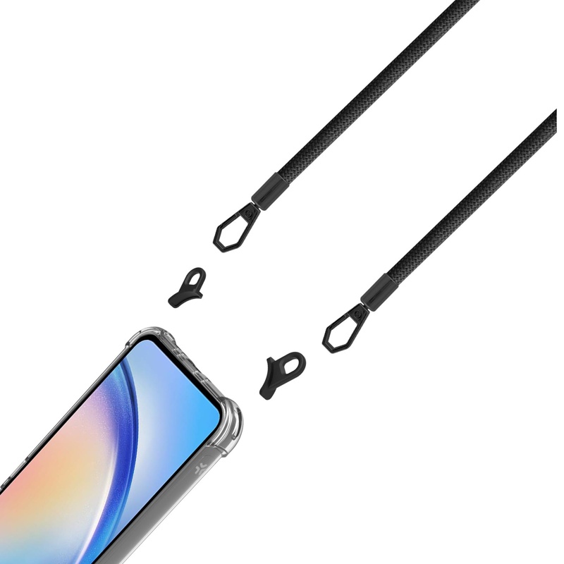- Läpinäkyvä TPU-kuori koukuilla ja nauhalla – puhelin kulkee mukanasi vaivatta