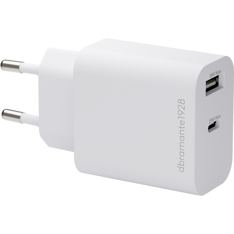 Toisin kuin useimmat laturit, dbramante1928-laturit on valmistettu 100 % kierrätetystä muovista ja ovat täysin kierrätettäviä. Tämä kompakti seinälaturi, jossa on 25 W USB-C- ja 18 W USB-A -portit, tarjoaa nopean ja turvallisen latauksen sekä USB-C- että USB-A-yhteensopiville laitteillesi. Se on tarkoituksella suunniteltu matkaystävälliseksi, ja taskukokoinen laturi sopii helposti kotiin, toimistoon tai mukaan matkalle.
