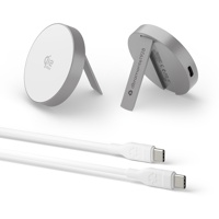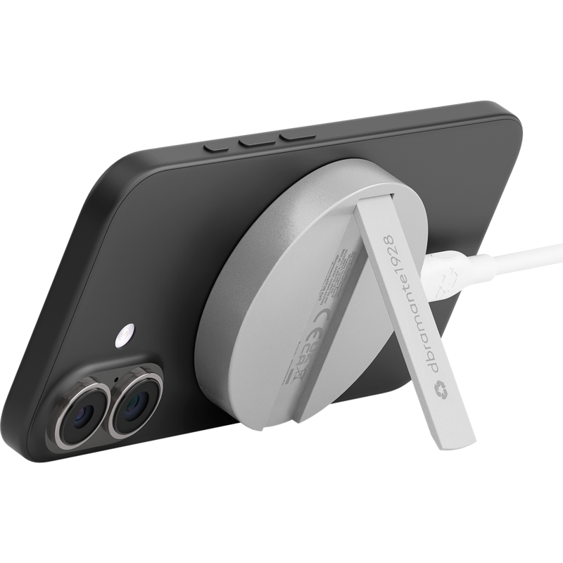 Integroitu taitettava jalusta pitää puhelimen pystyssä tai kallistettuna sekä pysty- että vaaka-asennossa latauksen aikana, mikä tekee siitä ihanteellisen videopuheluihin, suoratoistoon tai selailuun. Valmistettu kierrätetystä alumiinista, kuparista, tinasta ja TPE-materiaalista ja toimitetaan kierrätetystä TPE:stä valmistetun USB-C-kaapelin kanssa — yhdistäen viimeistellyn muotoilun vastuullisempiin materiaalivalintoihin.