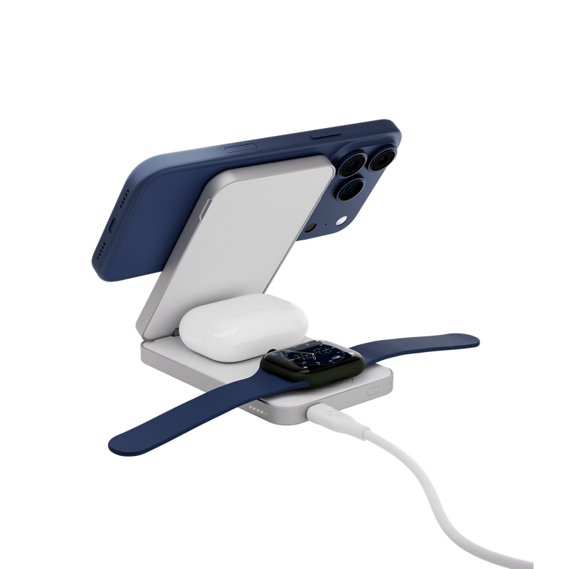 Voit ladata jopa neljää laitetta samanaikaisesti: iPhonea, Apple Watchia, AirPodseja (tai muita TWS-kuulokkeita) sekä yhtä laitetta USB-C-liitännän kautta, jopa 12 W kokonaisteholla. Erillinen 5 W Apple Watch -laturi tarjoaa nopeamman latauksen Apple Watch Ultra -kellolle sekä Series 6 -malleille ja uudemmille.