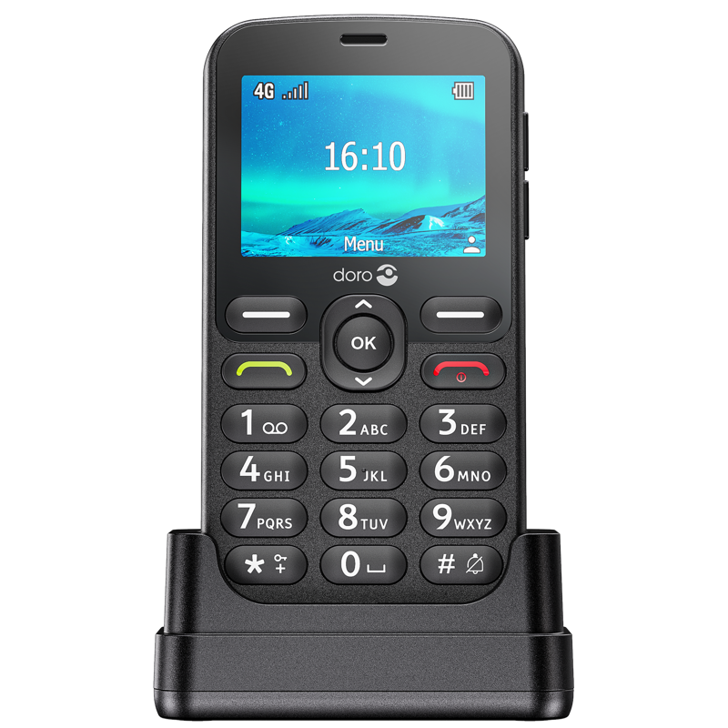 Doro 1881 puhelin, latausteline ja USB-kaapeli, käyttöohje. Huom! Virtalähde myydään erikseen.