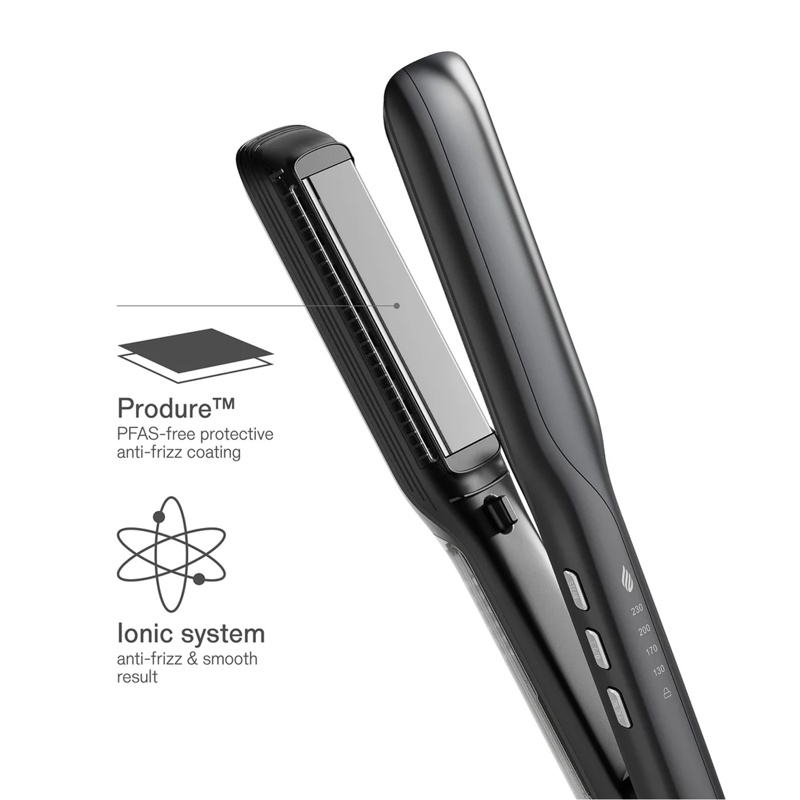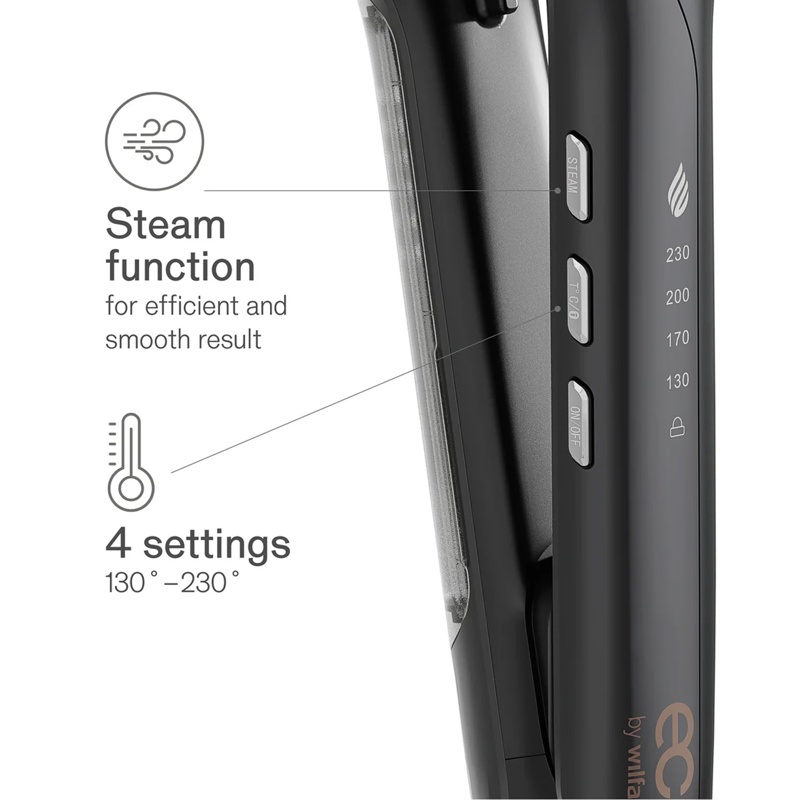 EC by Wilfan Flow Steamin tarjoama lämpö ja höyry yhdessä kosteuttavat jokaisella vedolla, vähentävät staattisuutta ja tekevät hiuksista pehmeämmät ja helpommin hallittavat. Säädettävä lämpötila ja ergonominen muotoilu takaavat hellävaraisen hoidon ja viimeistellyn lopputuloksen.