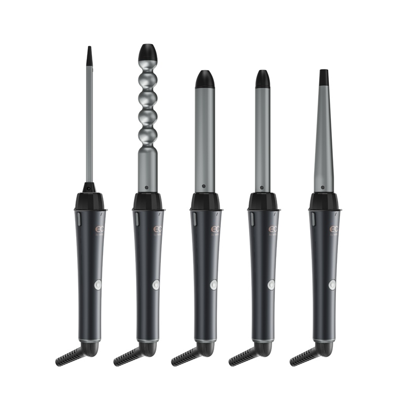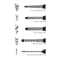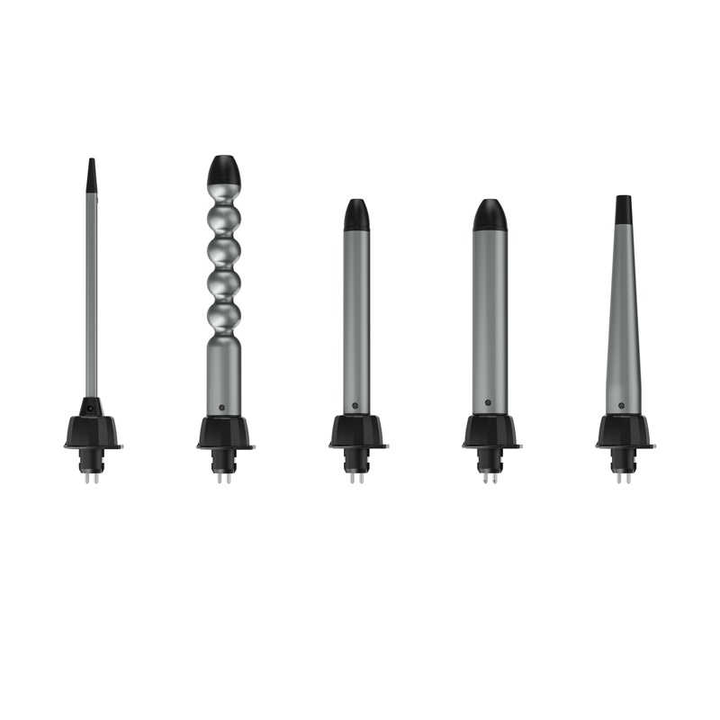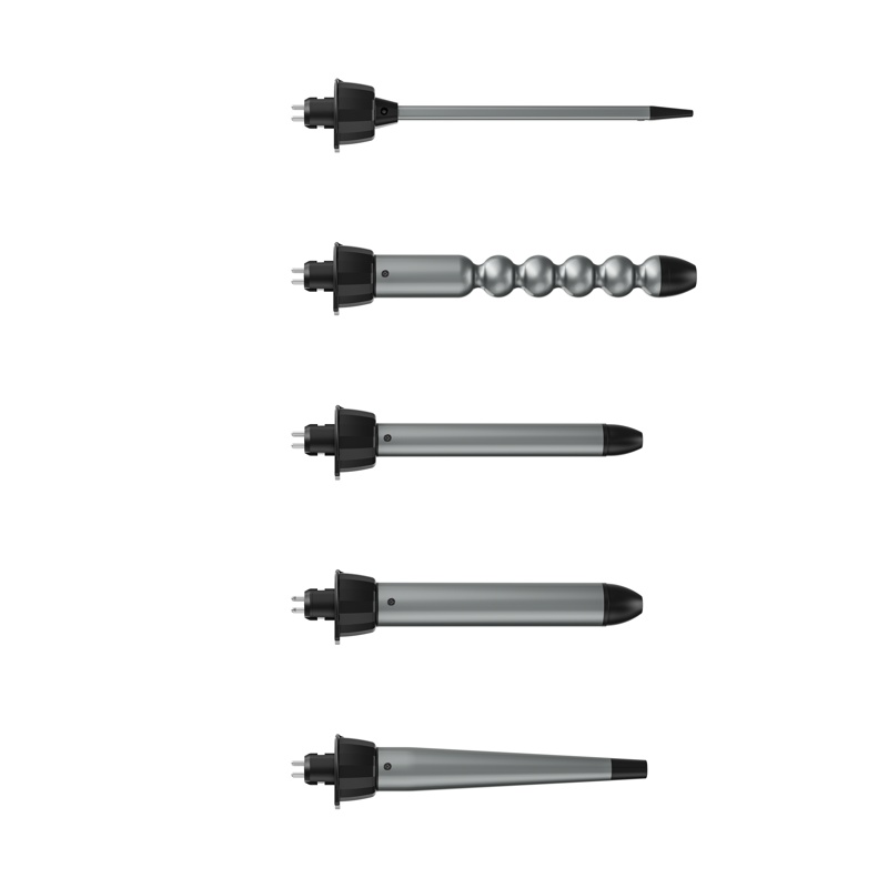 Viidellä vaihdettavalla kiharrinosalla yhdellä laitteella voit luoda useita eri tyylejä aina selkeistä kiharoista ilmaviin, huolettomiin aaltoihin. Kierrä ja napsauta vaihtaaksesi päätä ja valitaksesi päivän tyyli: