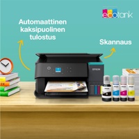 Säästä jopa 95 % tulostuskuluissa* Epsonin EcoTank-tulostimilla, joissa ei ole mustekasetteja. Tulostimen mukana toimitetaan riittoisat mustepullot, ja tulostimen sisällä olevat mustesäiliöt on helppo täyttää mustepulloista. Uudelleentäytettävät mustesäiliöt ja joustavat liitäntäominaisuudet tekevät tästä täydellisen tulostimen kaikille, jotka haluavat korkealaatuisia tulosteita uskomattoman alhaiseen sivuhintaan.
