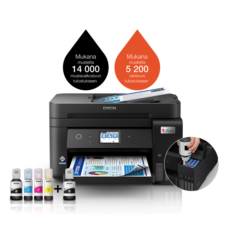 - Sano hyvästit mustekaseteille – täytä mustesäiliöt helposti ja siististi riittoisista mustepulloista