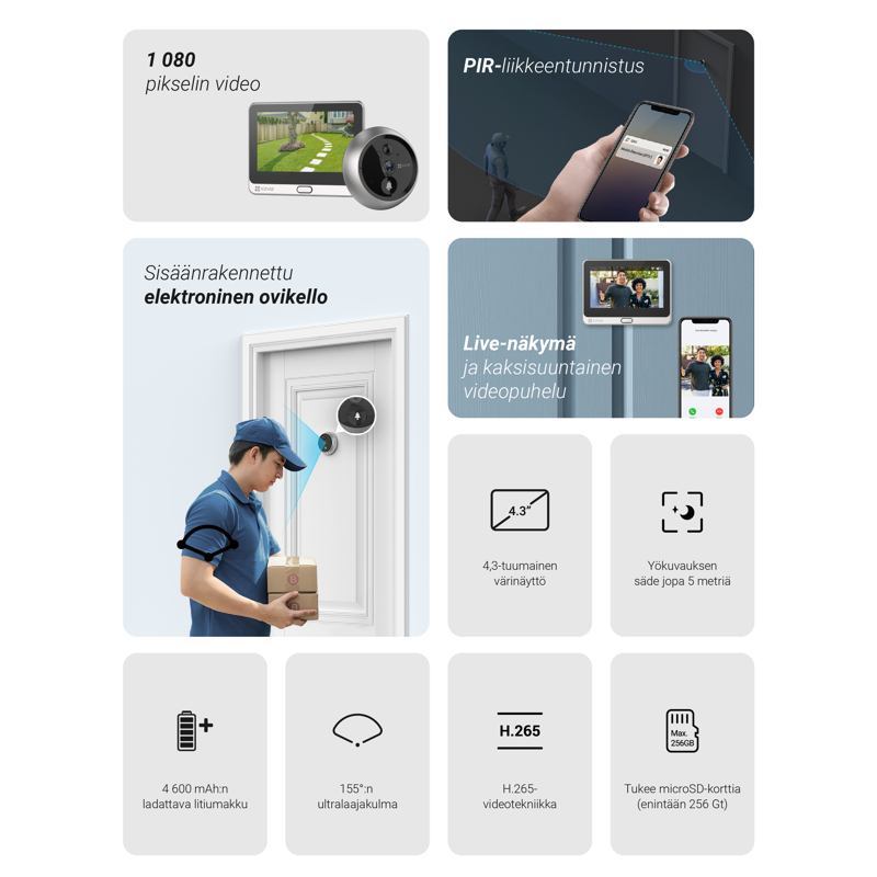 - Digitaalinen ovisilmä ja ovikello, jossa on useita edistyneitä ominaisuuksia etuovien valvontaan