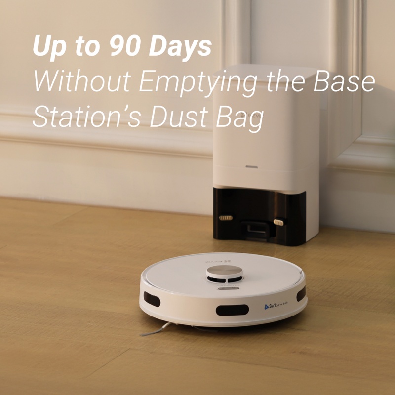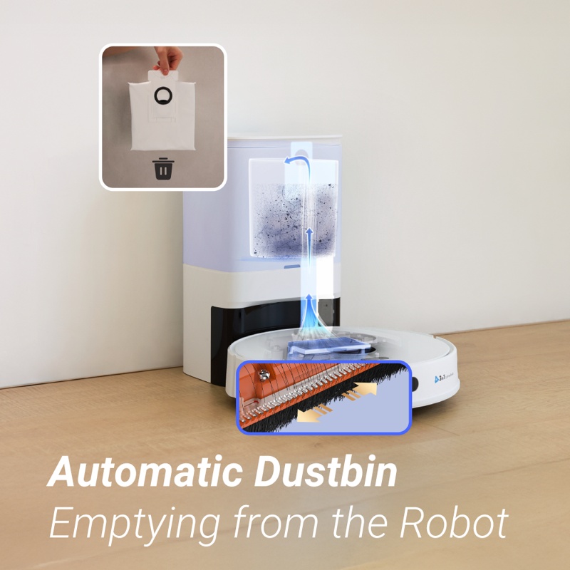 Tukiasema tyhjentää itsekseen sotkeutuvat jätteet edistyneellä rullaharjallaan, joten sinun ei tarvitse tehdä sitä manuaalisesti. Mikä parasta, voit yksinkertaisesti vaihtaa täyden 4 litran pölypussin 90 päivän välein sen sijaan, että tyhjennät robotin pölysäiliön manuaalisesti jokaisen siivoustehtävän jälkeen.