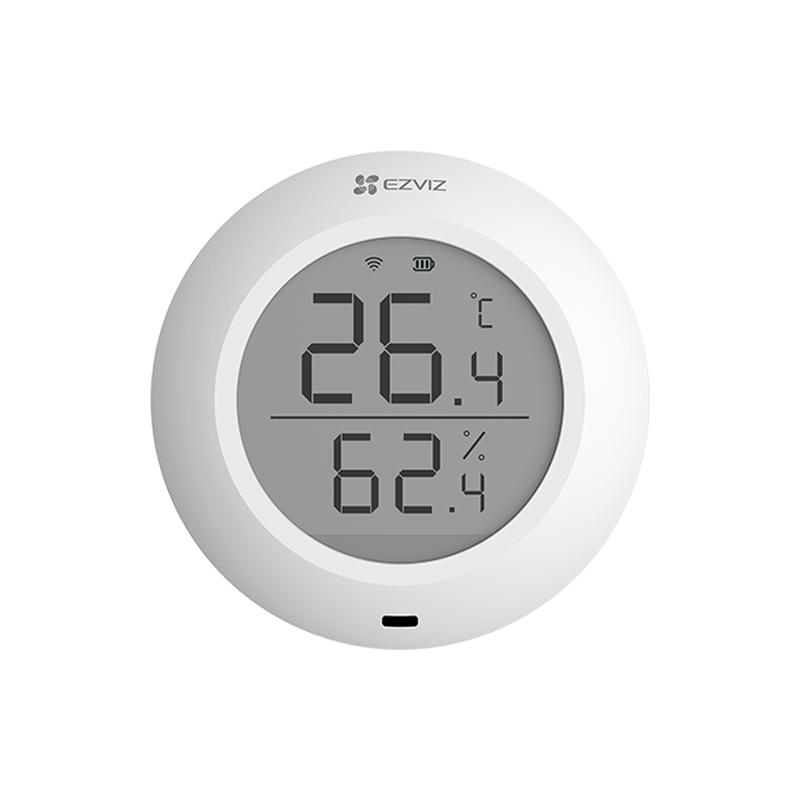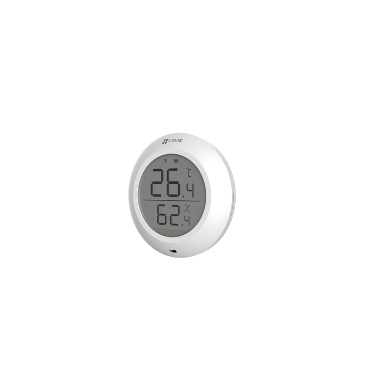 T51C on pienikokoinen, korkeatarkkuuksisen anturisirun sisältävä laite, joka havaitsee huoneen lämpötilan ja kosteuden ja visualisoi ne suurikokoiselle näytölle. Liitettyäsi sen EZVIZ Home Gateway -yhdyskäytävään voit myös tarkistaa tiedot reaaliajassa tai tarkastella historiatietoja EZVIZ-sovelluksessa ennen kotiin saapumistasi