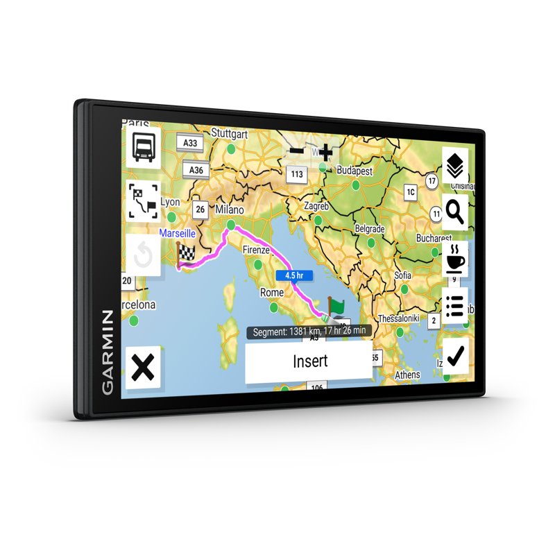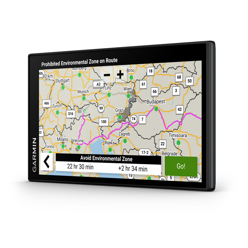 - Ajoneuvon mittojen ja painon perusteella mukautettava reititys ja tievaroitukset, hyödyllisiä ehdotuksia tankkaus- ja lepopaikoista ja erinomainen saapumisen suunnittelutoiminto