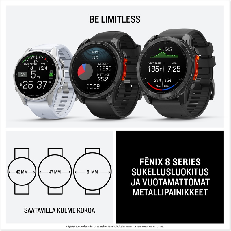 - Garmin Fenix 8 -urheilukello on suunnattu ammattiurheilijoille ja seikkailijoille, jotka haluavat ylittää rajojaan
