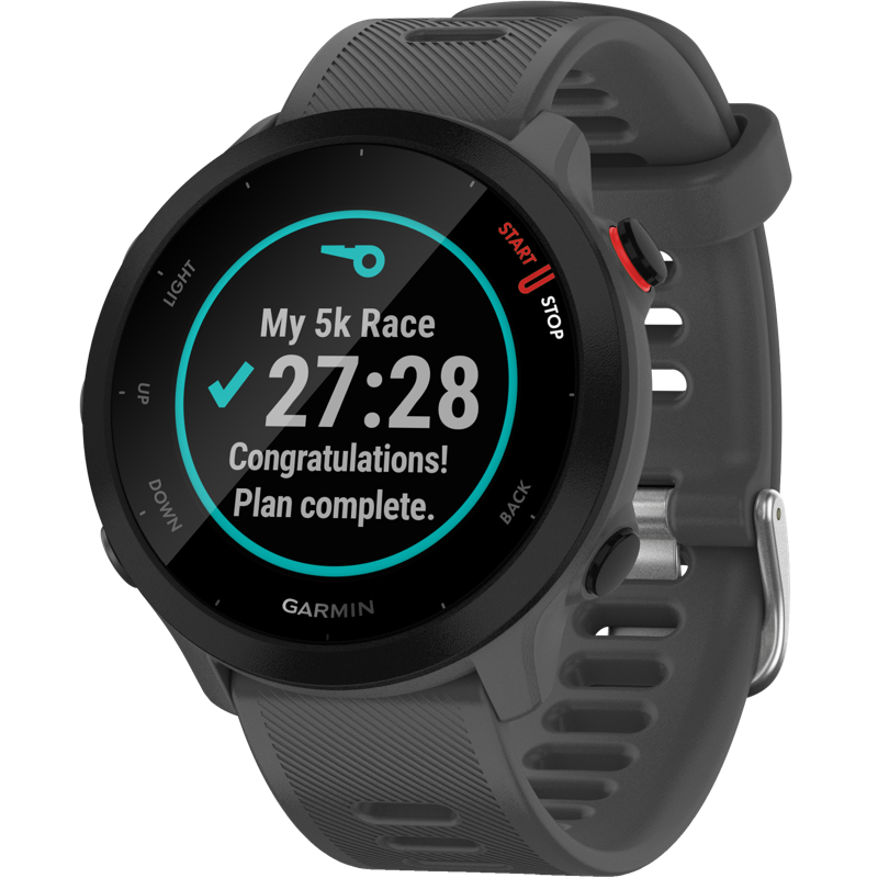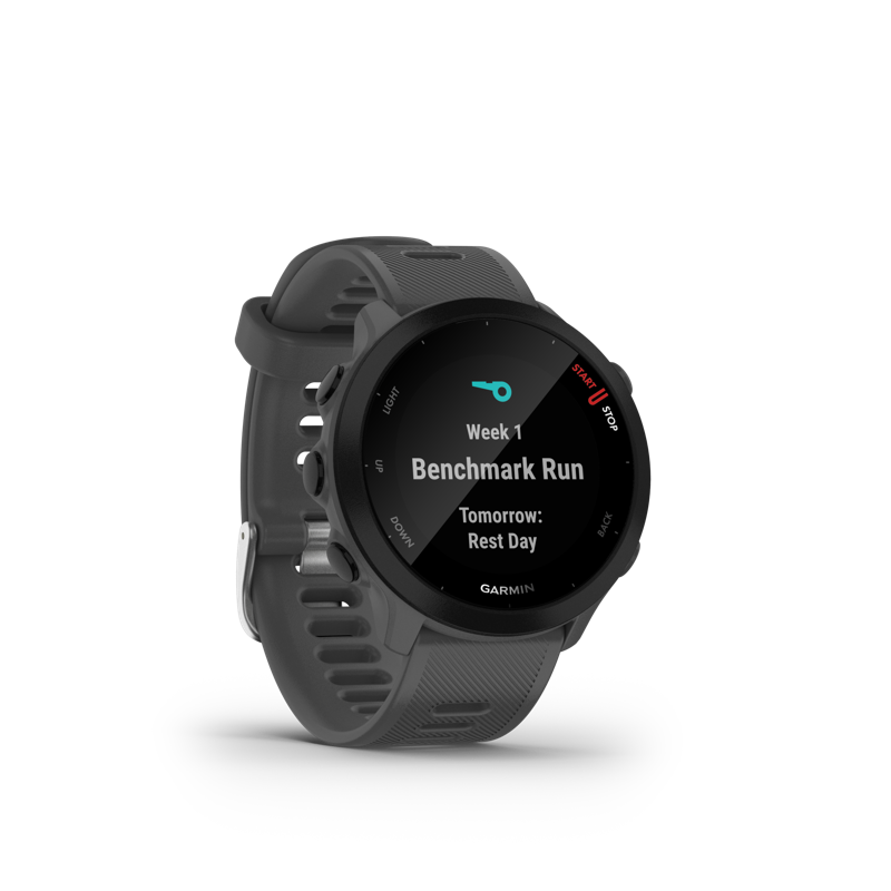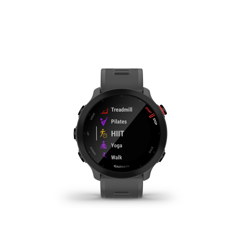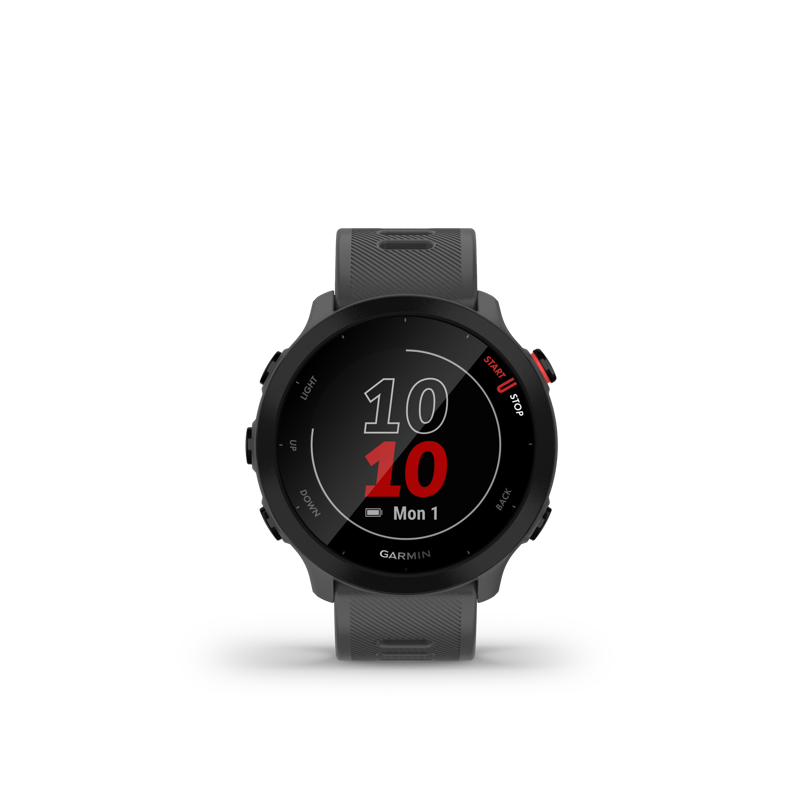 Garmin Forerunner 55 GPS-älykello on suunniteltu suoritustietojen seurantaan ja kuntotavoitteiden saavuttamiseen kaiken tasoisille juoksijoille, ja aivan erityisesti lajia aloitteleville. Juoksu- tai kävelysuoritus käynnistetään yhdellä painalluksella, minkä jälkeen laite mittaa ja näyttää aikaa, matkaa, nopeutta, vauhtia ja sykettä. Forerunner 55:ssä on kattavat juoksutiedot, päivittäin ehdotetut harjoitukset, urheilusovelluksia muihin lajeihin ja paljon muuta. Pariliittämällä kellon älypuhelimeesi, saat kätevästi sähköpostit, tekstiviestit ja muut ilmoitukset suoraan älykelloosi.