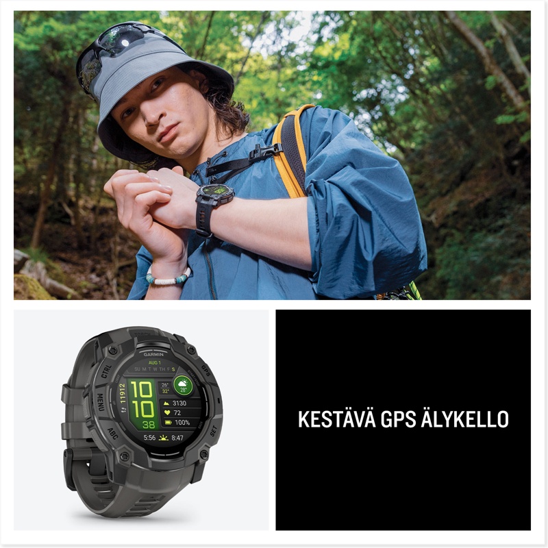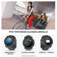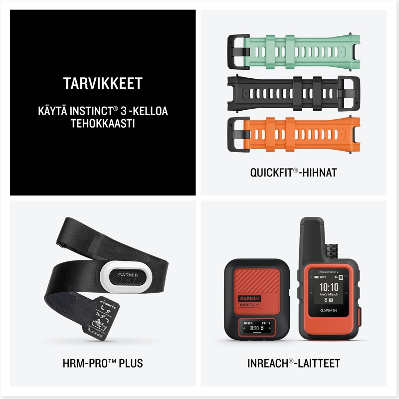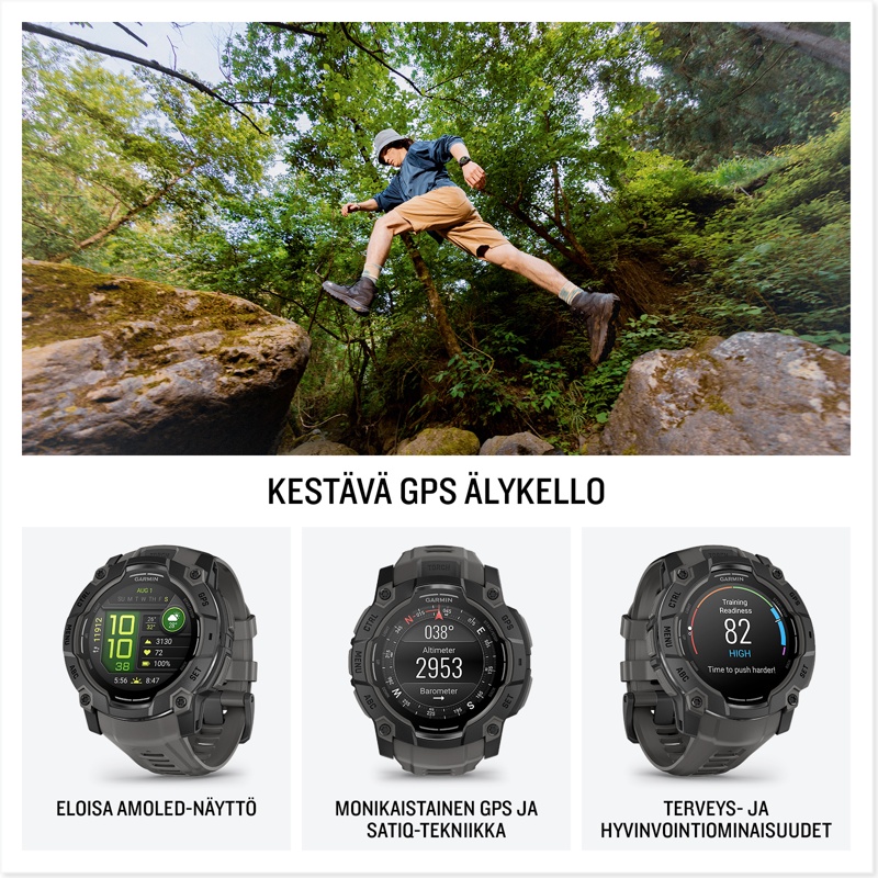 Instinct® 3 on kestävä GPS-älykello, jossa on AMOLED-näyttö ja sisäinen taskulamppu ja jonka akunkesto älykellotilassa on jopa 24 päivää. Sen ruuvikiinnitteinen rakenne, metallivahvisteinen kehys ja safiirilasi kestävät kovimmissakin seikkailuissa. Sillä on MIL-STD-810-standardien mukainen lämmön- ja iskunkestävyys, ja sen vesitiiviysluokitus on 10 ATM. Instinct 3 -älykello pitää sinut reitillä sisäisen kolmiakselisen kompassin ja barometrisen korkeusmittarin avulla. Lisäksi SatIQ™-tekniikalla toimiva monikaista-GPS takaa erinomaisen paikannuksen ja optimoi akunkeston. Ympärivuorokautisilla terveyden ja hyvinvoinnin seurantaominaisuuksilla voit seurata kehosi toimintaa esimerkiksi sykkeen seurannan, edistyneen unen tarkkailun ja pulssioksimetrin avulla. Lisäksi Instinct 3 -kellossa on Garmin Pay™ -lähimaksuominaisuus (toimintoa tukevan pankin avulla).