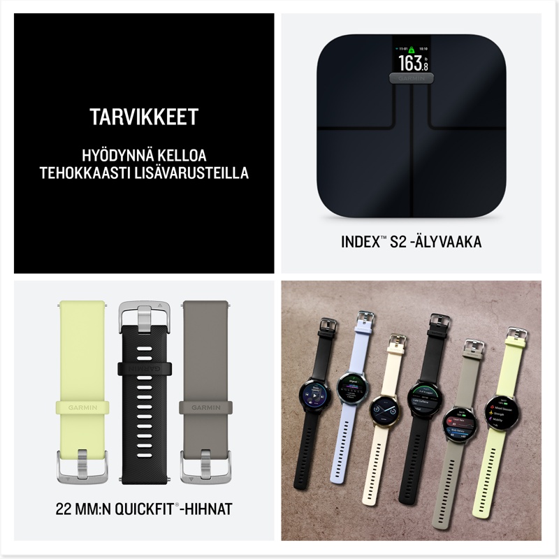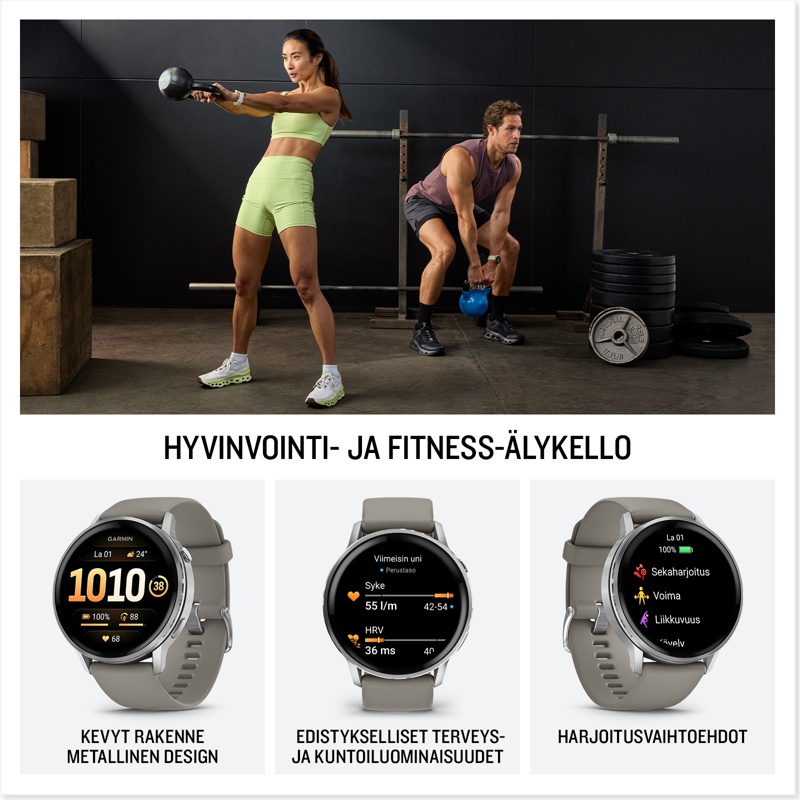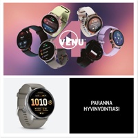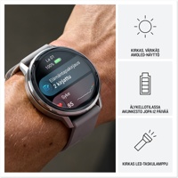 Ruostumattomasta teräksestä valmistettu Venu 4 -GPS-älykello sisältää kaikki tarvittavat edistykselliset ominaisuudet, joiden avulla voit tutustua kehoosi entistä paremmin ja edistää terveellisempää elämäntapaa. Siinä on myös kirkas, värikäs näyttö. Jopa 10–12 päivän akunkeston ansiosta voit jatkaa aktiivista elämää päivästä toiseen. Body Battery™ -energianseuranta seuraa kehon energiatasoa, jotta tiedät parhaat ajat toimintaan ja lepoon. Voit hyödyntää unenlaadun parantamiseen räätälöityjä unitietoja, kuten unen kohdistumistietoja, joista näet, onko vuorokausirytmisi tasapainossa. Terveydentila-ominaisuus havaitsee terveystietojesi muutoksia, jotka voivat viitata kehosi kuormittumiseen, jotta tiedät, milloin kehosi tila poikkeaa tavallisesta. Räätälöidyissä Garmin Coach juoksu-, pyöräily-, voima- ja kuntoiluharjoitusohjelmissa voit hyödyntää jokaista suoritustasi. Voit lisätä suorituksiisi vaihtelua helposti seurattavilla animoiduilla harjoituksilla, päivittäisillä harjoitusehdotuksilla ja yli 80 sisäisellä urheilusovelluksella, joista yksi on suunnattu aktiivisille pyörätuolin käyttäjille. Kun kirjaat mukautettua tai esimääritettyä päivittäistä toimintaa, kuten kofeiinin tai alkoholin saantia, voit katsoa Garmin Connect™ -älypuhelinsovelluksen raporteista, miten tapasi saattavat vaikuttaa kokonaisterveydentilaasi. Kaikki annetut älykellotiedot ovat tarkahko arvio seurattavista mittauksista. Lisäksi voit soittaa ja vastata puheluihin kellolla, kun se on pariliitetty älypuhelimeesi.