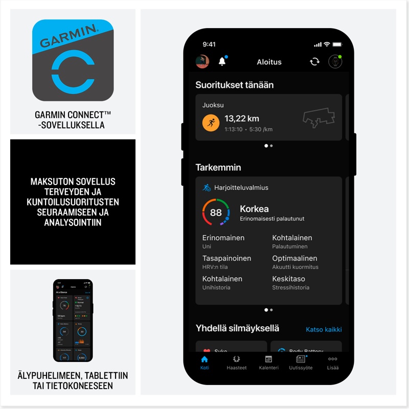 - Optimoi terveytesi hyödyntämällä sykevälivaihtelun tilaa, edistynyttä unen tarkkailua ja Body Battery -energianseurantaa