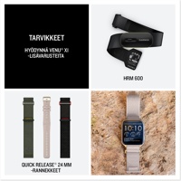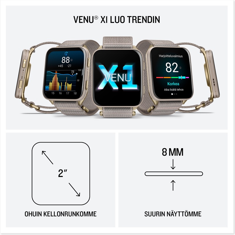 Venu X1 GPS -älykellossa on ohut 2" selkeä AMOLED -näyttö, ja ohut kellonkotelomme, jonka paksuus on ainoastaan 8 mm. Lisäksi siinä on safiirilinssi ja kirkas LED-taskulamppu. Voit käyttää sitä jatkuvasti vuorokauden ympäri virtaviivaisen ja kevyen rakenteen, jopa 8 päivän akunkeston (älykellotilassa) ja ComfortFit-nailonhihnan ansiosta. Optimoi terveytesi hyödyntämällä sykevälivaihtelun tilaa, edistynyttä unen tarkkailua ja Body Battery -energianseurantaa (annetut tiedot ovat tarkahko arvio seurattavista mittauksista). Seuraa intohimojasi yli 100 esiladatulla urheilusovelluksella juoksusta ja golfista voimaharjoitteluun. Harjoittele tapahtumaan, saavuta virstanpylväs tai kohota kuntoasi Garmin-valmentajan juoksu-, pyöräily- tai voimaharjoitusohjelmilla. Harjoittele fiksummin ja maksimoi suorituskykysi hyödyntämällä harjoitteluvalmiuspisteitä, harjoittelun tilaa ja kestävyyspisteitä ja valmistaudu päivän koitoksiin (annetut tiedot ovat tarkahko arvio seurattavista mittauksista). Kun pariliität kellon älypuhelimeen, pysyt yhteydessä ja voit soittaa ja vastata puheluihin suoraan kellolla sisäisen kaiuttimen ja mikrofonin kautta. Sisäisten TopoActive-karttojen ja yli 43000 esiladatun golfkentän avulla voit navigoida niin poluilla, kaupungissa kuin kentällä.