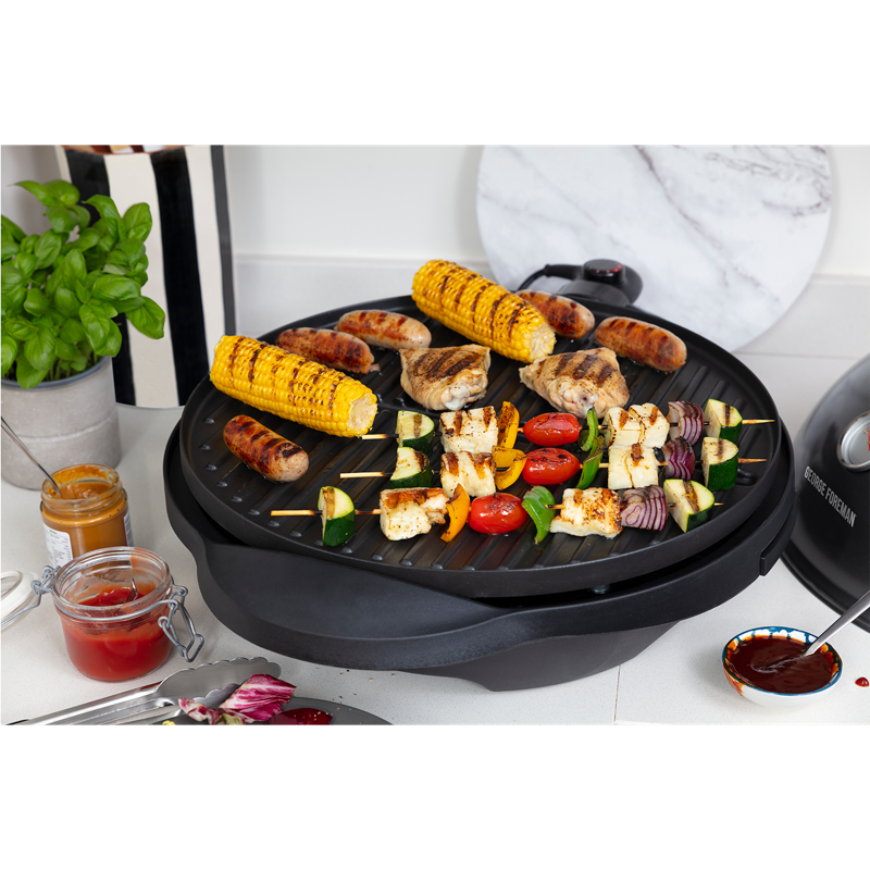 George Foreman Indoor Outdoor ‑sähkögrilli sopii täydellisesti sekä sisä‑ että ulkokäyttöön. Grillin suuri paistopinta mahdollistaa jopa 15 annoksen valmistuksen kerralla, joten se on erinomainen valinta isommillekin grillijuhlille. Non‑stick‑pinnoitetut paistolevyt tekevät käytöstä vaivatonta, ja grilli on helppo puhdistaa käytön jälkeen. Grillissä on 5 eri lämpötila-asetusta.