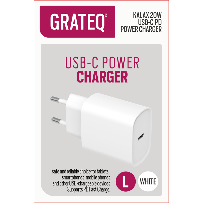 Grateq Kalax 20 W USB-C -seinälaturi sopii niin puhelimesi, tablettisi tai älykellosi kuin muidenkin kannettavia laitteidesi lataamiseen. Laturissa on yksi USB-C-liitäntä ja se tukee Power Delivery -pikalataustekniikkaa. Kaikki Grateq-verkkolaturit testataan CE-testauksen lisäksi myös eräkohtaisesti SGS Fimkolla tuoteturvallisuuden varmistamiseksi.
