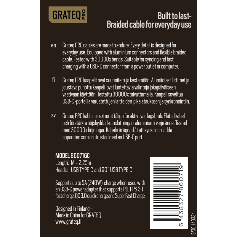 Grateq PRO kaapelit ovat suunniteltuja kestämään. Alumiiniset liittimet ja joustava punottu kaapeli ovat luotettavia valintoja jokapäiväiseen vaativaan käyttöön. Testattu 30 000 kertaa taivuttamalla. Kaapeli soveltuu USB‑C‑porteilla varustettujen laitteiden pikalataukseen ja synkronointiin. Toinen liitin on kätevässä 90 asteen kulmassa.