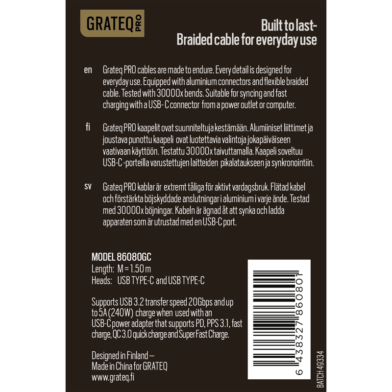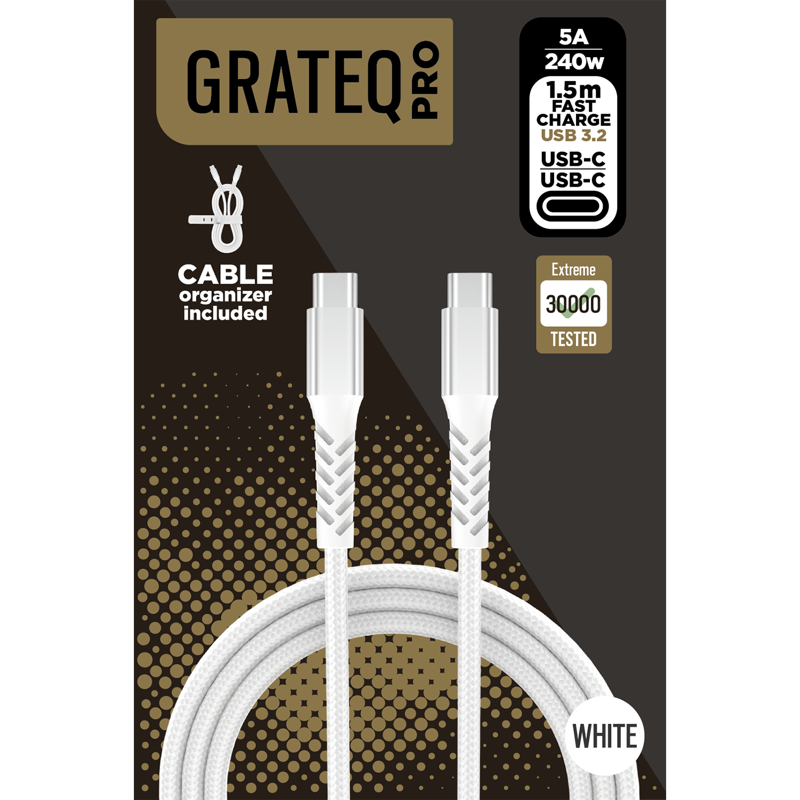 Grateq PRO -kaapelit ovat suunniteltuja kestämään. Alumiiniset liittimet ja joustava punottu kaapeli ovat luotettavia valintoja jokapäiväiseen vaativaan käyttöön. Testattu 30 000 kertaa taivuttamalla. Kaapeli soveltuu USB‑C‑porteilla varustettujen laitteiden pikalataukseen ja synkronointiin. Kaapelin pituus on 1,5 m ja maksimiteho jopa 240 W..