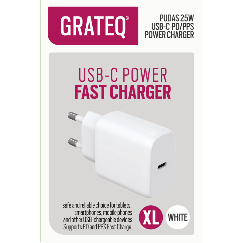 Grateq Pudas 25 W USB-C -seinälaturi sopii niin puhelimesi, tablettisi tai älykellosi kuin muidenkin kannettavia laitteidesi lataamiseen. Laturissa on yksi USB-C-liitäntä ja se tukee Power Delivery -pikalataustekniikkaa. Kaikki Grateq-verkkolaturit testataan CE-testauksen lisäksi myös eräkohtaisesti SGS Fimkolla tuoteturvallisuuden varmistamiseksi.