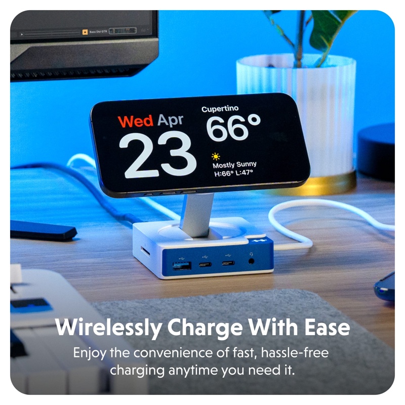 Unohda johtosotkut. Sisäänrakennettu 7,5W Qi-laturi lataa puhelimesi tai langattomat kuulokkeet suoraan työpisteellä – vähemmän johtoja, enemmän vapautta.