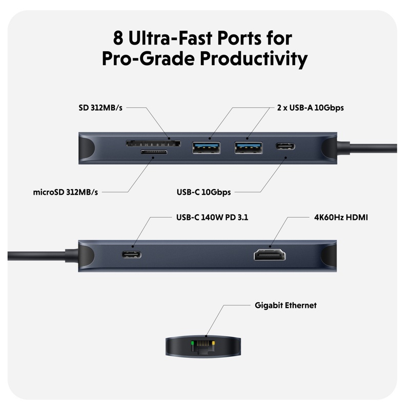 HyperDrive Next 8-porttinen USB-C -telakka on nykyaikainen ratkaisu liitettävyyden laajentamiseen olit sitten sisällöntuottaja, valokuvaaja, toimittaja, tai muuten vaan haluat varautua monenlaisiin tilanteisiin. 4K 60 Hz:n näytön tuki MacBookille, iMacille PC:lle ja Chromebookille, 8 erittäin nopeaa liitäntäporttia ja salamannopea tiedonsiirto säästävät aikaasi. Koe 2x nopeampi tiedostojen siirto 10 Gbps USB-porttien avulla ja 3x nopeampi valokuvien ja videoiden siirto microSD- ja SD 4.0 -kortilla. Kytke laturisi keskittimeen ja lataa laitteesi jopa 125 W:n teholla 140 W PD 3.1 -laturilla, kun kytkettynä PD 3.1 -tukevaan laitteeseen. Tämä varmistaa myös tulevaisuudessa laitteidesi maksimaalisen virransaannin ja tekee keskittimestä ihanteellisen virtaa kuluttaville laitteille. Teet myös ekologisesti kestävän ratkaisun valitsemalla HyperDrive Next -telakan, sillä se on valmistettu 100 % kierrätetystä alumiinista ja 85 % kierrätetystä muovista, ja se kuuluu kestävästi valmistettujen EcoSmart -tuotteiden sarjaan.