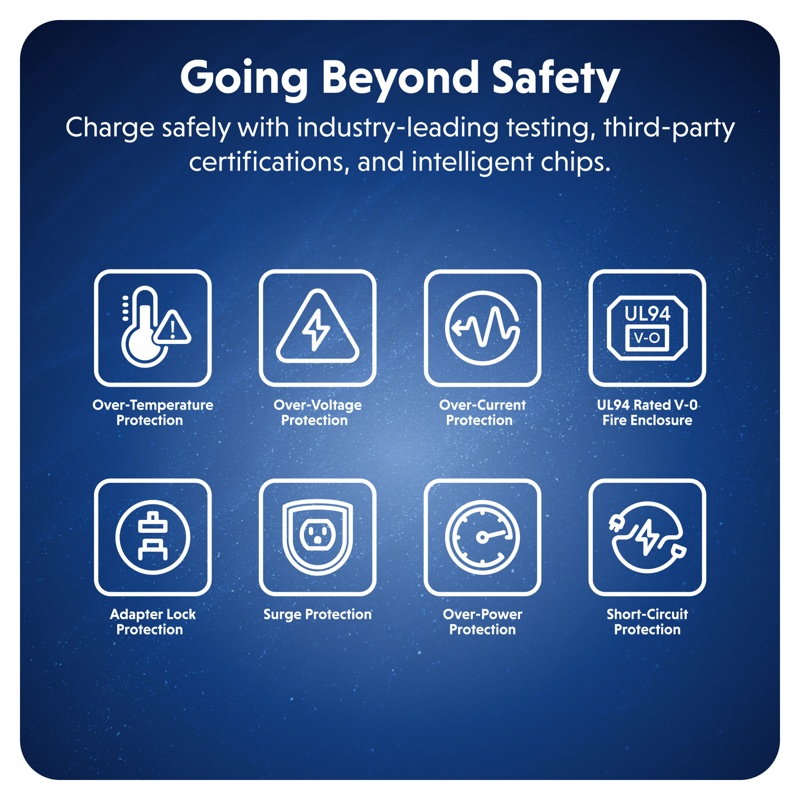 Laturissa on ylivirta-, ylijännite-, ylilämpötila- ja oikosulkusuojaus, sekä ohjelmoitava virransyöttö PPS (Programmable Power Supply), joka mahdollistaa virran ja jännitteen vaiheittaiset muutokset. Se vähentää muunnoshäviötä latauksen aikana, mikä varmistaa latauksen tehokkuuden. Kun lataus on tehokkaampaa, lämpöä tuotetaan vähemmän, ja kun lämpöä tuotetaan vähemmän, akun käyttöikä pitenee. Joten PPS-pikalataus on parempi laitteesi akulle ja voit varmuudella nauttia turvallisesta laitteidesi lataamisesta. Älykäs lataus PD 3.0-, PPS-, QC 3.0- ja QC 2.0-protokollilla.Myyntipaketissa mukana tulee EU, UK, AU, US ja C8 vaihdettavat verkkovirtasovittimet, jotka tekevät laturista täydellisen kumppanin myös ulkomailla matkustettaessa.