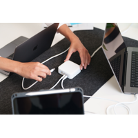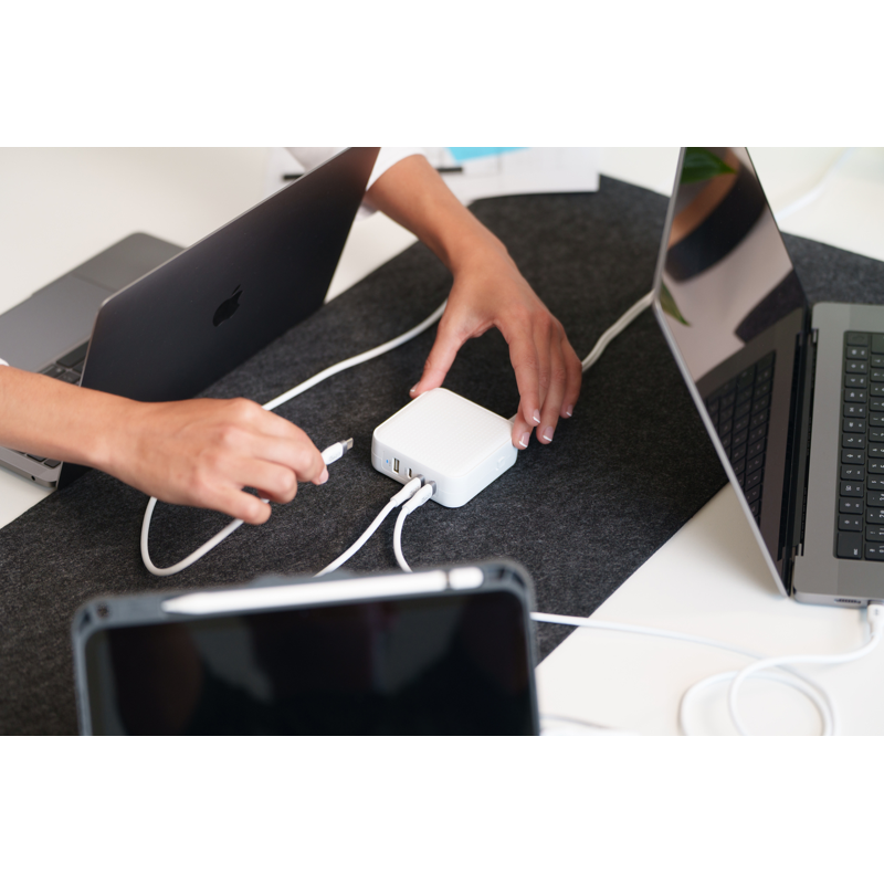 Voit ladata neljää laitetta samanaikaisesti kolmen USB-C- (yhdellä portilla jopa 100W) ja yhden USB-A-portin (joka tukee jopa 18W) avulla. Voit siis ladata esim. kannettavan tietokoneen, tabletin, puhelimen ja kuulokkeet samanaikaisesti. Kevyen ja ohuen rakenteensa vuoksi laturi on erittäin kompakti kantaa laukussa mukana.
