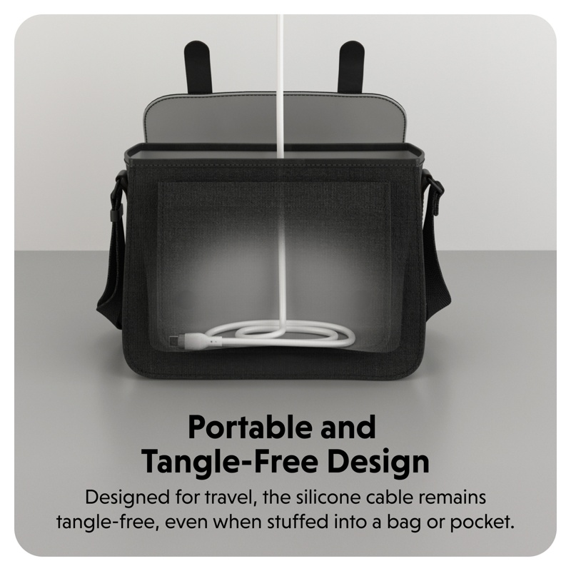 Materiaalinsa ansiosta johto on erittäin kestävä ja käytännössä solmuuntumaton, joten se on helppo sulloa esim. taskuun, tai laukkuun mukaan ja tarvittaessa se on aina helposti käytettävissä.