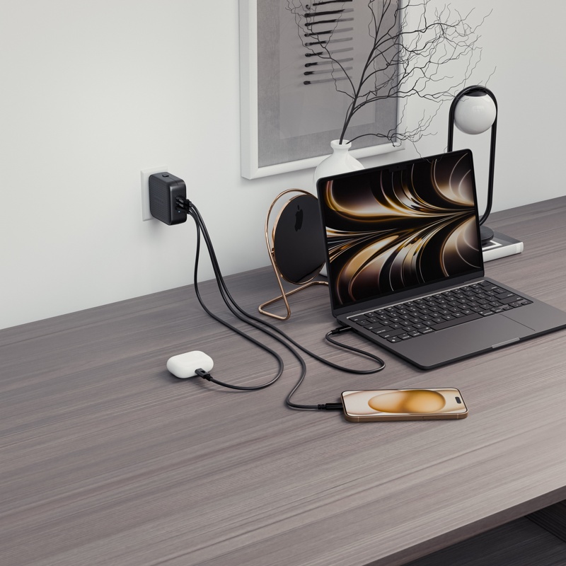 Voit ladata kolmea laitetta samanaikaisesti kahden USB-C- (yhdellä portilla jopa 70W) ja yhden USB-A-portin (joka tukee jopa 18W) avulla. Voit siis ladata esim. tabletin, puhelimen ja kuulokkeet samanaikaisesti, tai käyttäessäsi kahta porttia voit ladata samanaikaisesti kannettavan tietokoneen, sekä puhelimen tai tabletin. Kevyen ja ohuen rakenteensa vuoksi laturi on erittäin kompakti kantaa laukussa mukana.