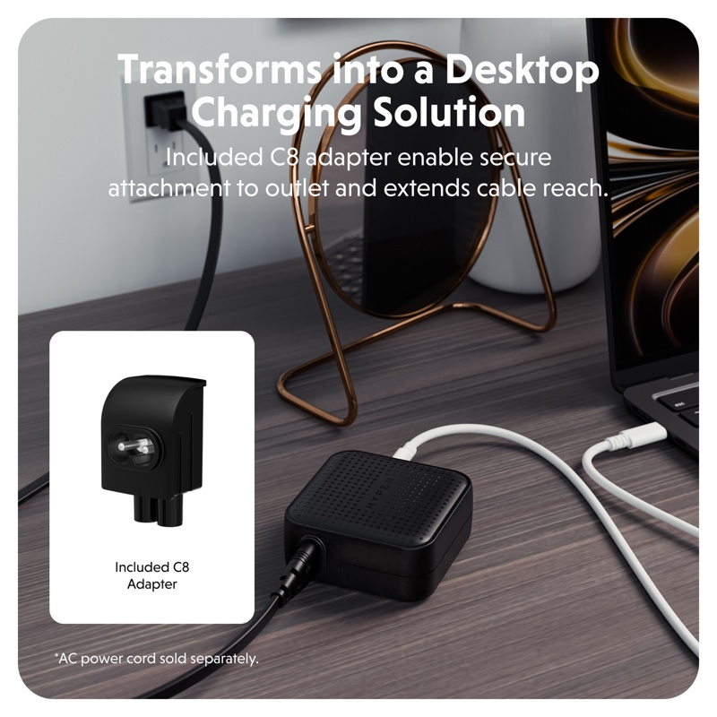 Adapterien ansiosta laturi toimii yli 150 maassa. Etätyöläisten ja ”maailma on toimistoni” -elämäntapaa noudattavien iloksi laturin mukana tulee kätevä C8-sovitin: sovittimella muutat laturin helposti esim. pöytälaturiksi, kun saat lisättyä ulottuvuutta kytkemällä laturiin C7-virtakaapelin (kaapeli myydään erikseen). Tämän monikäyttöisyyttä lisäävän ominaisuuden ansiosta saat laturin palvelemaan käyttötarvettasi myös tilanteissa, joissa pistorasia saattaa olla hieman etäämpänä, kuten kahvilassa tai lentoasemalla.