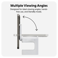 Puhelimen katselukulmaa voi portaattomasti säätää vaaka-asennosta jopa täysin pystyasentoon omaan käyttöön sopivaksi. Tarkisteletpa sitten ilmoituksia, katselet videoita, soitat videopuheluita tai käytät iOS StandBy -tilaa*, voit asettaa laitteesi juuri sinulle optimaaliseen asentoon. (*Käyttämällä iPhonen StandBy-toimintoa voit tarkastella valitsemiasi tietoja iPhonen näytöltä latauksen aikana, kuten kelloradio, digitaalinen valokuvakehys, widget-näyttö, Live-seurannan laajana ruutuna yms.)