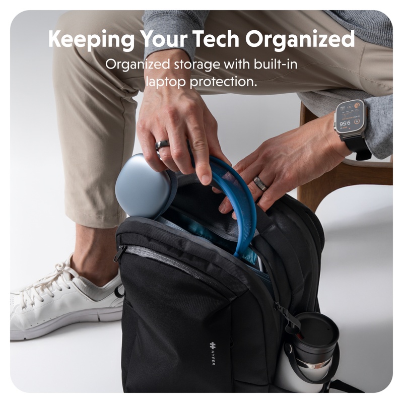 Lataa kannettava tietokone, tabletti, kuulokkeet ja puhelimesi HyperPackin kaapeliläpivientien kautta samalla kun kuljet paikasta toiseen. (Power Bank ja kaapelit myydään erikseen)