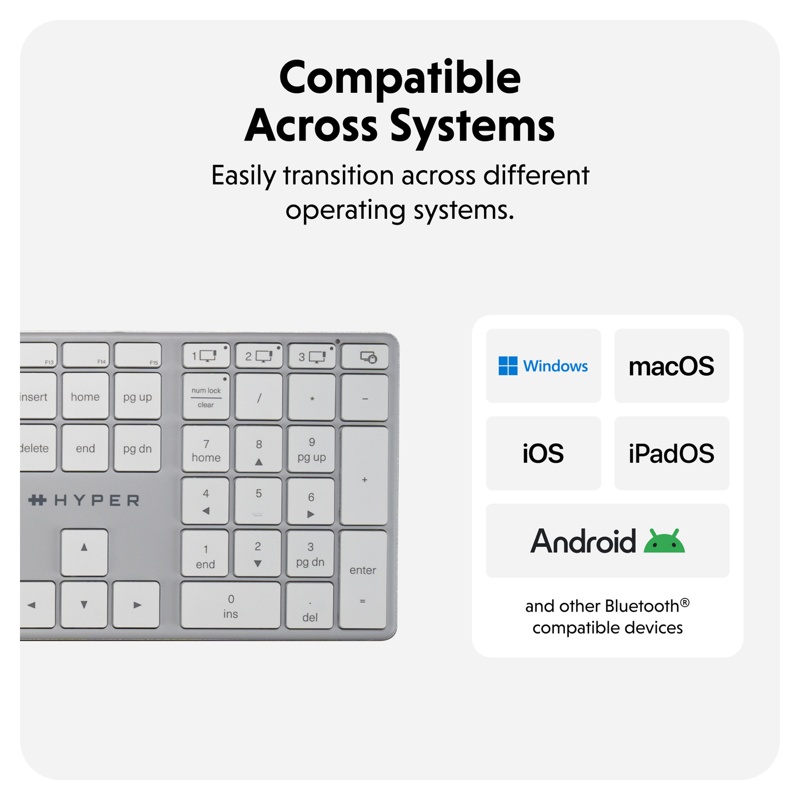 Olipa käytössäsi macOS®, Windows®, iPadOS tai jokin muu käyttöjärjestelmä, näppäimistö toimii saumattomasti kaikilla laitteilla.