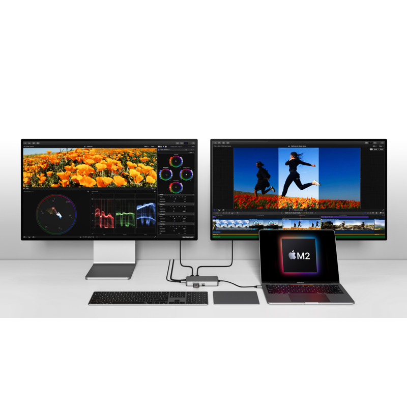 - Lataa laitteet tehokkaasti – USB-C 100 W PD -läpilataus mahdollistaa tietokoneen lataamisen telakan läpi jopa 85 W teholla