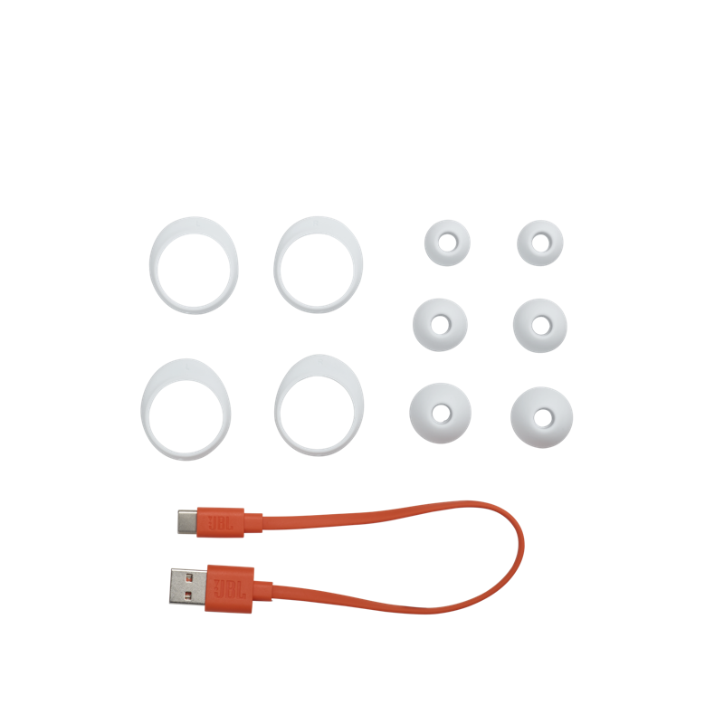 3 korvanipukkaparia (pieni, keskikokoinen, iso), 2 paria korvatulppia, USB-C latauskaapeli, latauskotelo (300 mAh)