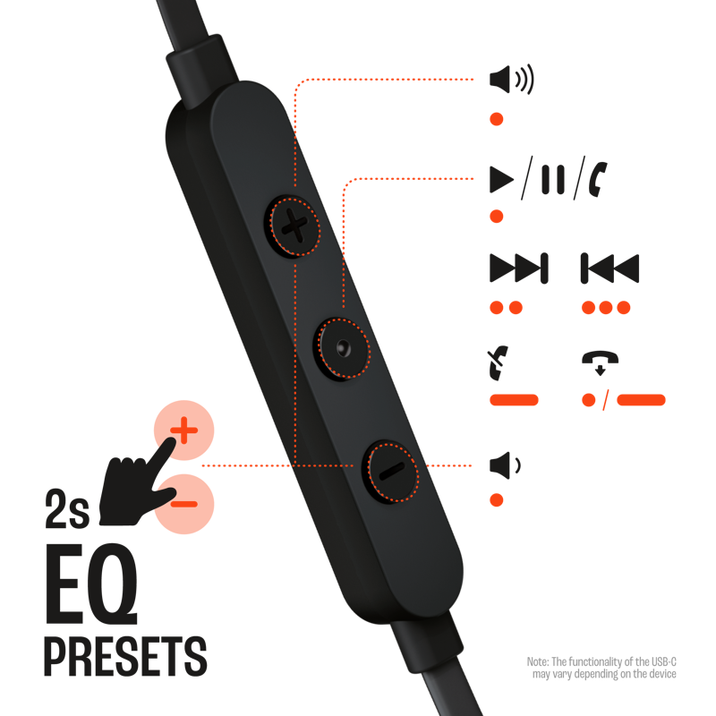 JBL Tune 305C USB-C -nappikuulokkeet ovat kevyet, mukavat ja kompaktin kokoiset. Kaksi 12,5 mm:n dynaamista elementtiä tuottavat voimakkaan JBL Pure Bass -äänen, ja korkearesoluutioisen audion tuki takaa erinomaisen äänenlaadun. USB-C-liitännän ansiosta kuulokkeet ovat yhteensopivat monien eri laitteiden, kuten tietokoneiden, mobiililaitteiden ja pelilaitteiden kanssa. Lisäksi sotkeutumattomassa litteässä johdossa on kolmipainikkeinen kauko-ohjain, jolla voit ohjata musiikin toistoa ja äänenvoimakkuuden säätöä, taajuuskorjaimen esiasetuksia sekä vastata puheluihin lennossa sisäänrakennetun mikrofonin välityksellä. Kaikki tämä tekee JBL Tune 305C USB-C -nappikuulokkeista luotettavan arjen audiokumppanin töihin, kotiin ja tien päälle.