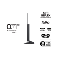 Pelaajille suunnitellussa OLED G5 -televisiossa on 165 Hz:n G-Sync- ja FreeSync-tuki, joka poistaa kuvan repeämisen ja tekee liikkeestä silkinpehmeää. LG:n Game Optimizer- ja Dashboard-toimintojen avulla voit hienosäätää asetuksia reaaliajassa parhaan suorituskyvyn takaamiseksi. Salamannopea 0,1 ms:n vasteaika ja alhainen viive antavat kilpailuetua, kun taas henkeäsalpaavat OLED-kuvat tekevät jokaisesta maailmasta mukaansatempaavamman.