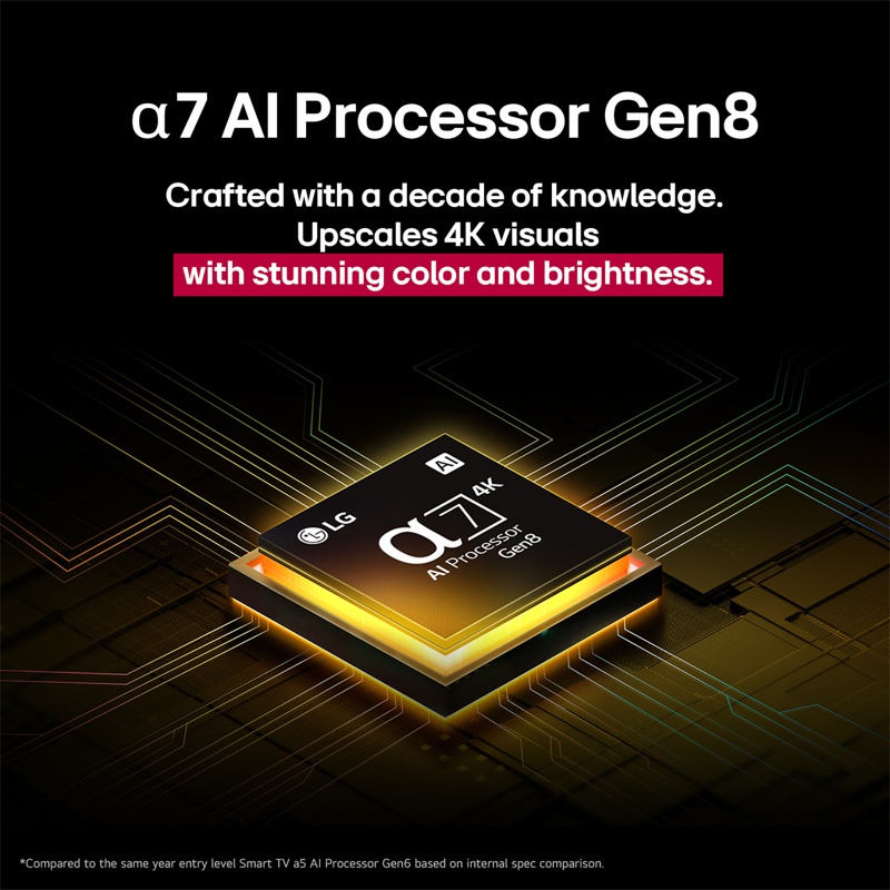 Merkittävästi tehokkaammin ja nopeammin toimiva alpha 7 AI Processor Gen8 tuottaa nyt 4K-kuvanlaatua entistä paremmalla terävyydellä ja syvyydellä. Ihaile 4K-sisältöä todentuntuisen tarkoilla väreillä ja tarkoilla yksityiskohdilla, jotka tekevät joka kuvasta visuaalisesti näyttävän ja nautittavan. LG:n tehokas prosessori nostaa resoluution alkuperäiseen laatuunsa. Nauti entistä paremmasta resoluutiosta, kirkkaudesta ja selkeydestä, joita 4K Super Upscaling tuo laitteeseesi.