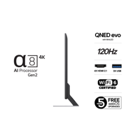 Tämä tarkoittaa α8 AI Processor 4K -prosessorin, korkealla kuvataajuudella varustetun näytön ja QNED-television värejä parantavan näyttöteknologian yhdistelmää. Kaikissa QNED evo -televisioissa on nämä toiminnot. Tämä takaa 100 % värivolyymin, merkittävän väriskaalan laajenemisen viime vuoden malliin verrattuna ja Dolby Vision -tuen.